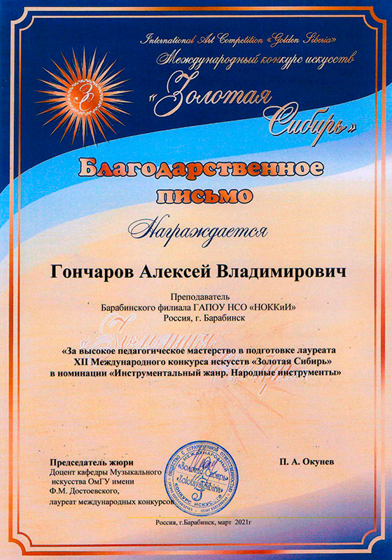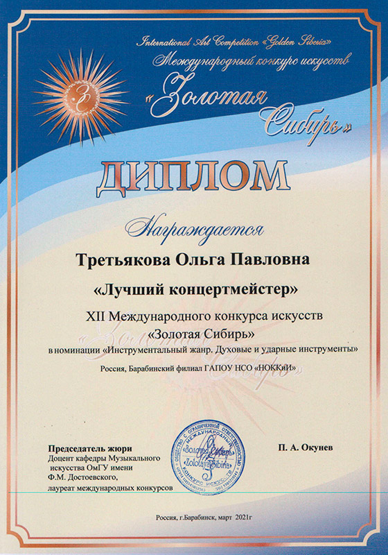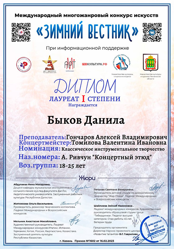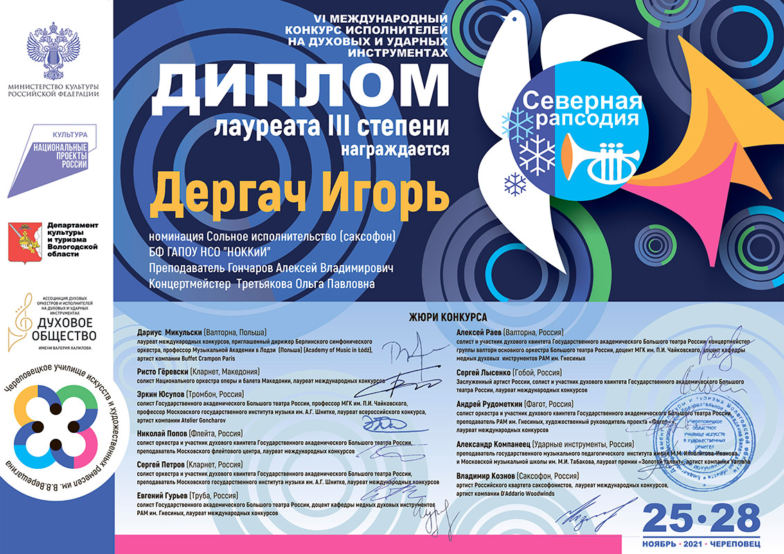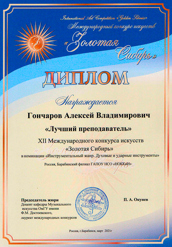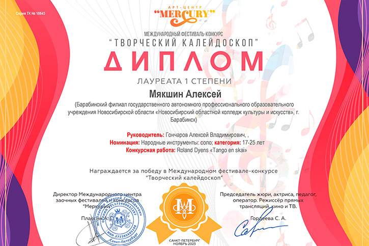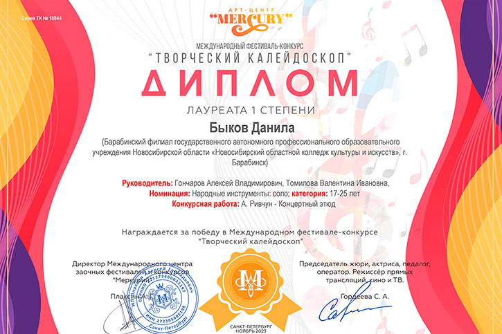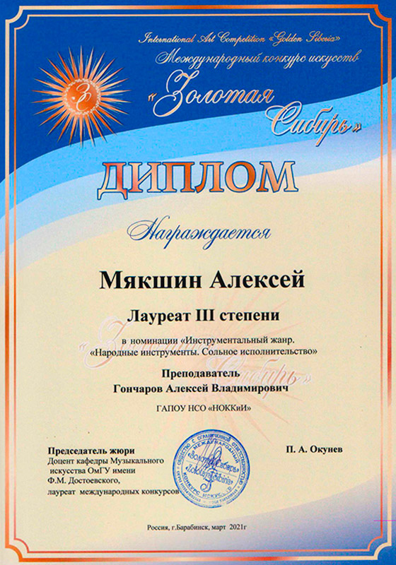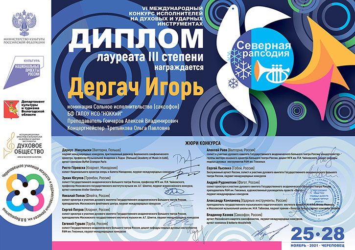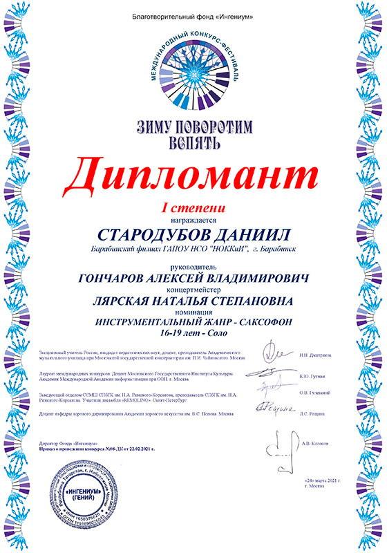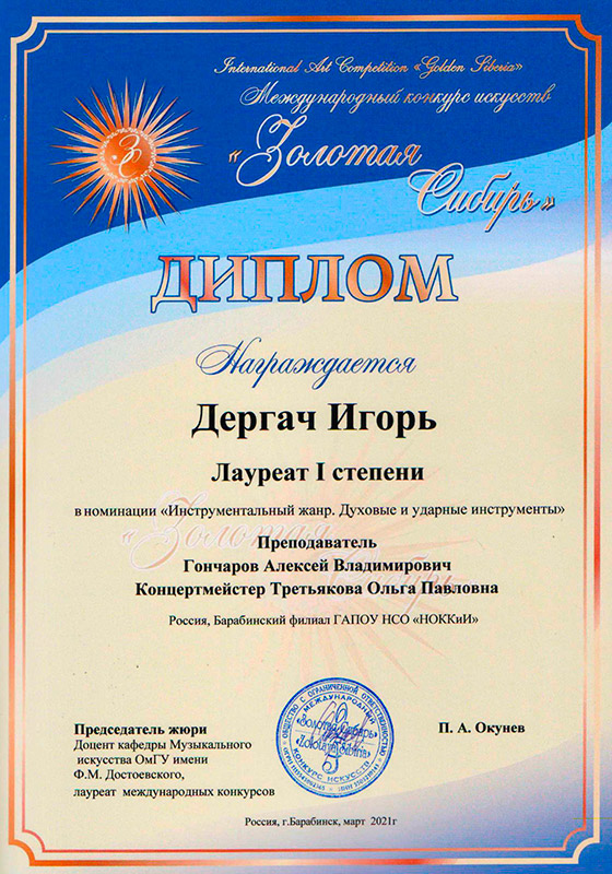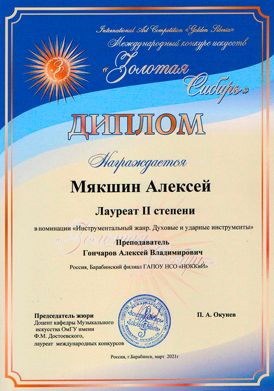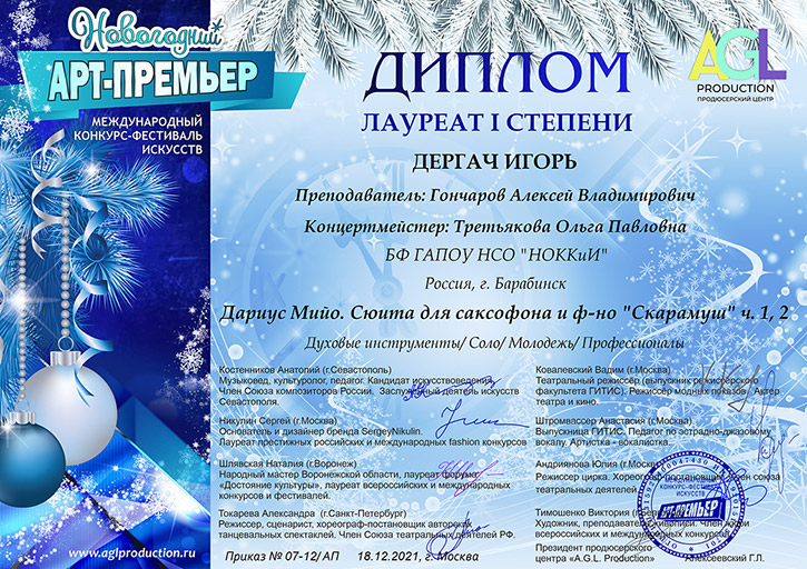 - звание лауреата I степени в международном конкурсе "Сибирь зажигает звёзды" в номинации "Инструментальный джаз",