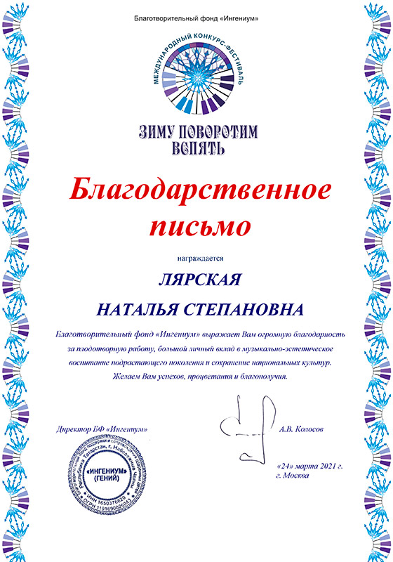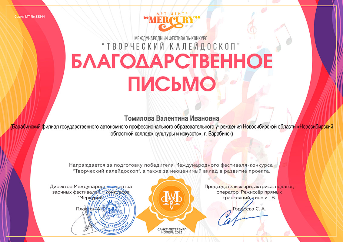 Квалификация: педагог дополнительного образования (в области музыкальной деятельности).