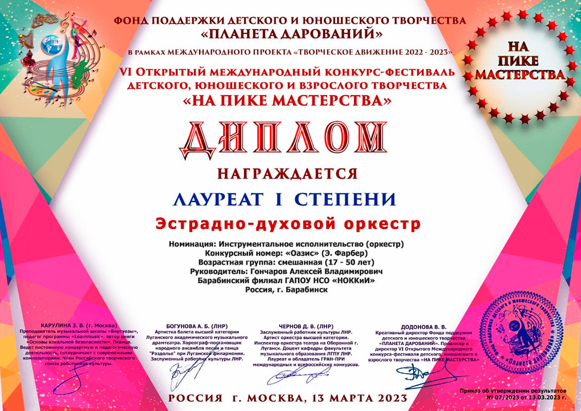 - звание лауреата 1-й степени в межрайонном конкурсе духовых эстрадных оркестров.