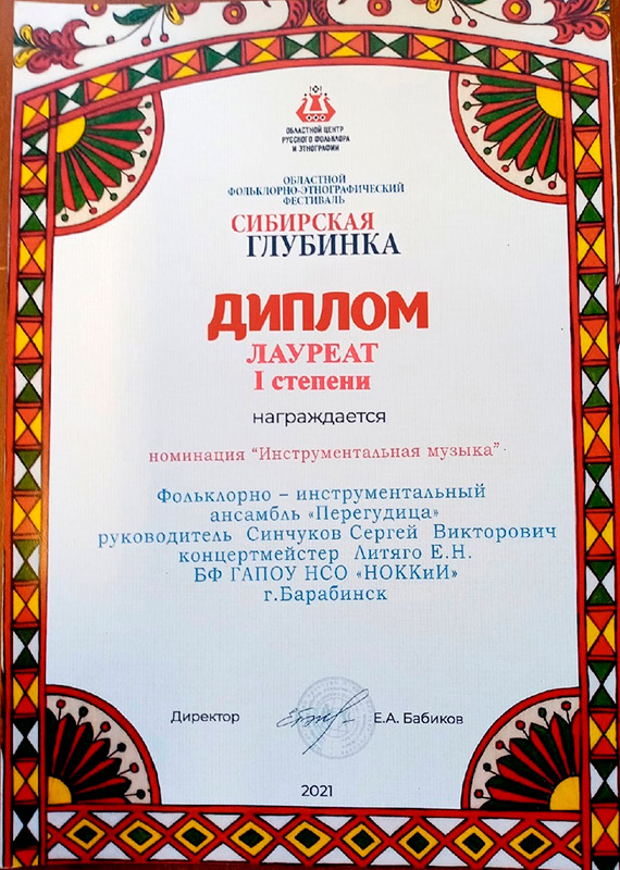 Поздравляем всех участников фестиваля и участников Барабинского филиала ГАПОУ НСО "НОККиИ" - фольклорный ансамбль "Коляда", руководитель Н.С.Тормоза, концертмейстер Е.Н.Литяго и фольклорно-инструментальный ансамбль "Перегудица", руководитель Синчуков С.В., концертмейстер Е.Н.Литяго с дипломом Лауреата I степени.