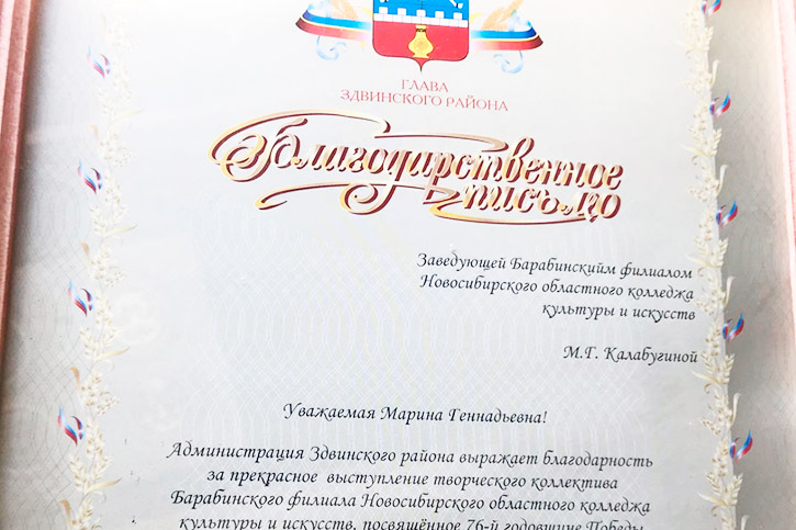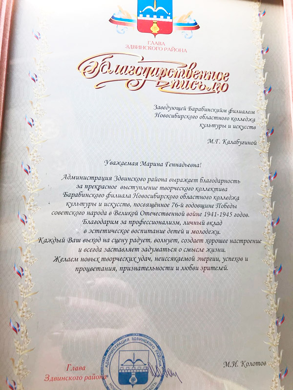Слова благодарности от Депутата Государственной Думы РФ В.А.Игнатова, главы Здвинского района. Наши артисты стали украшением всех праздников-благодаря таланту, красоте и вкладу всех студентов и преподавателей колледжа в эти важное мероприятие.