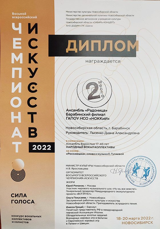 Специальность "Сольное и хоровое народное пение" (по виду: хоровое народное пение) 18-20 марта в г.Новосибирске приняли участие в VIII Всероссийском ЧЕМПИОНАТЕ ИСКУССТВ 2022г. Конкурсные испытания по направлению "Сила голоса" прошли 34 коллектива из разных регионов России.