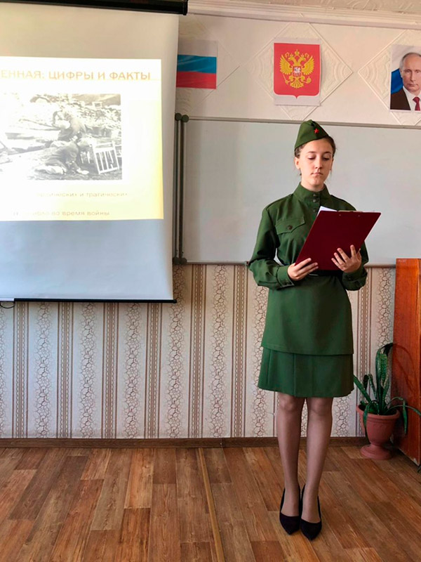 В рамках проведённого мероприятия мы все вместе вспомнили цифры и факты Победы в Великой Отечественной войне, талантливых полководцев этой войны. Почтили память миллионов жертв фашисткой агрессии против советского союза минутой молчания.