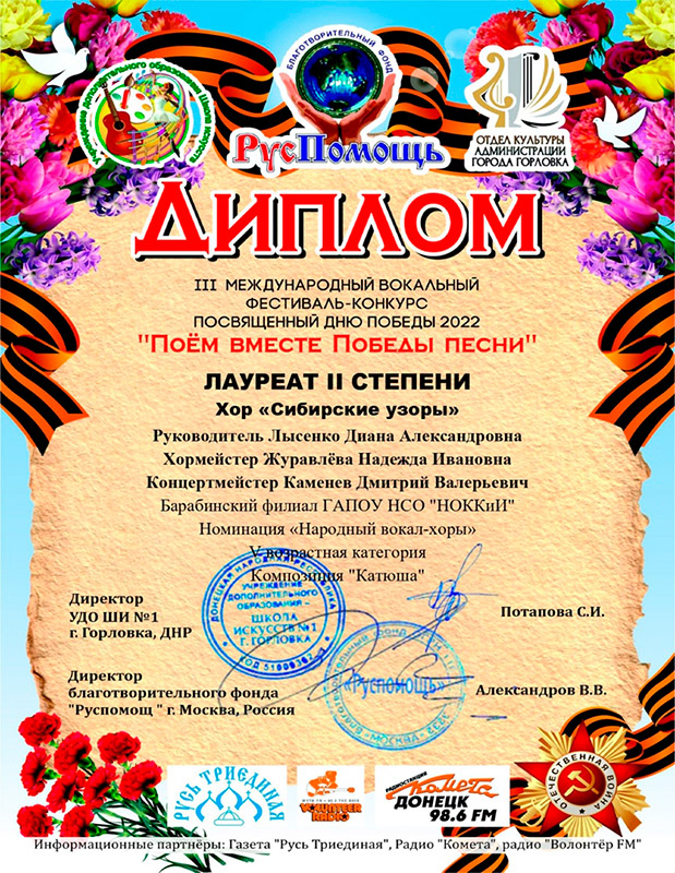 Подведены итоги III Международного вокального фестиваля-конкурса посвящённого Дню Победы 2022 "ПОËМ ВМЕСТЕ ПОБЕДЫ ПЕСНИ". Народный Хор Барабинского филиала "Сибирские узоры" исполнил произведение "Катюша" (музыка М.Блантера, слова М.Исаковского, аранжировка И.Черновского) и стал лауреатом II степени среди 483-х участников. Благодарим организаторов конкурса за высокую оценку.