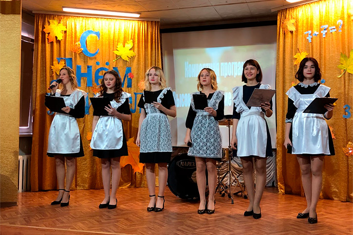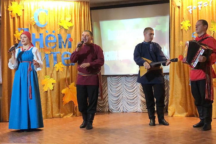В актовом зале собрался педагогический коллектив, преподаватели, которые уже не первый год работают в колледже, а также молодые специалисты, только начинающие свой путь на поприще просвещения. Поддержать своих любимых преподавателей, выступление творческих коллективов пришли и благодарные студенты всех специальностей, скромно занявшие места на "камчатке". Но скромность сменялась бурными овациями. Студенты посвятили стихотворения, песни любимым преподавателям. Было сказано много хороших слов о представителях учительской профессии. Глядя на счастливые лица зрителей после окончания концерта, было очевидно, что такой подарок пришелся по вкусу преподавателям! В концертной программе принимали участие молодые преподаватели колледжа, творческие коллективы - вокальный ансамбль "Узорень", рук. Сотников С.Е., фольклорный ансамбль "Тереха", рук. Тормоза Н.С., фольклорно-инструментальный ансамбль "Перегудица", рук. Синчуков С.В., народно-инструментальный ансамбль "Суматоха", рук. Шевченко А.А., вокальный ансамбль "Вольница", рук. Шадура Н.Р., солисты - Геншафт О., Кондакова Л., Гусева Л., Богаченко У., студ. 3 курса СиХНП, Николаев А. , студ. 1 курса СКД, оригинальным номером поздравили студенты специальности СКД, Студенческий Совет подготовил видео - поздравление от студентов колледжа.
