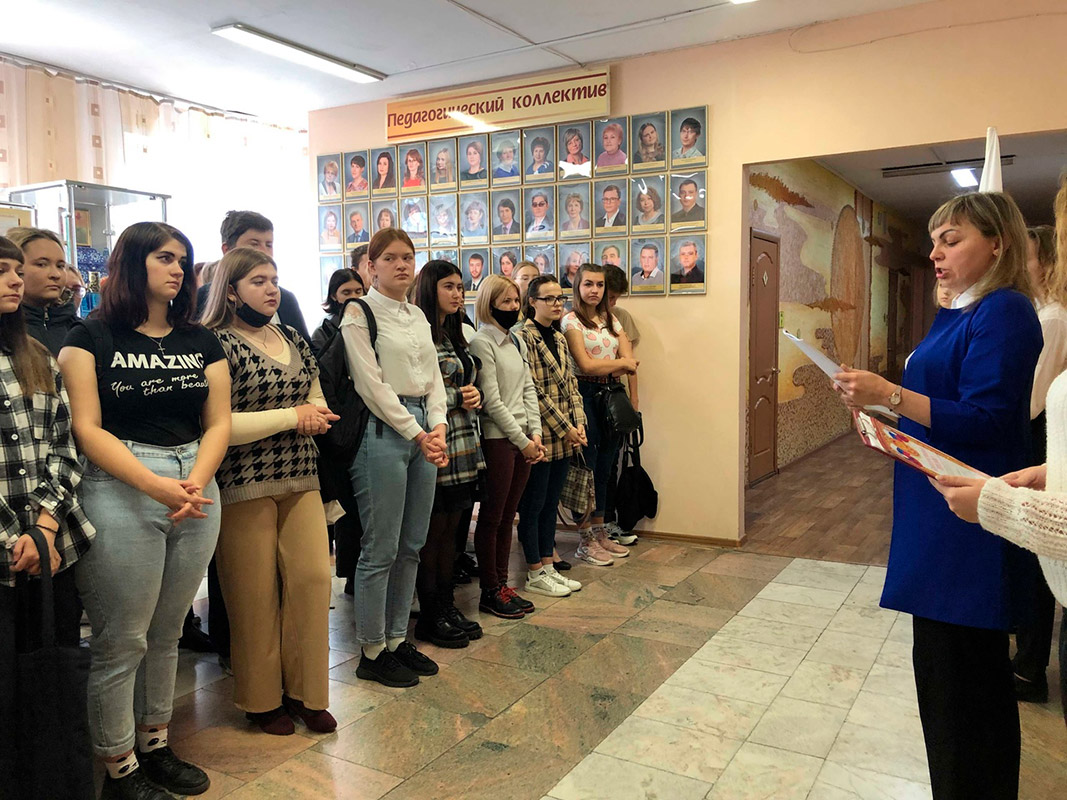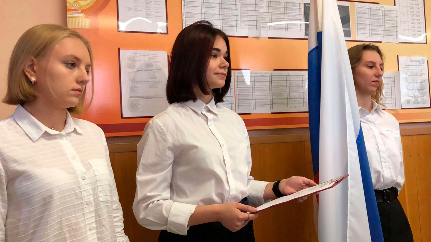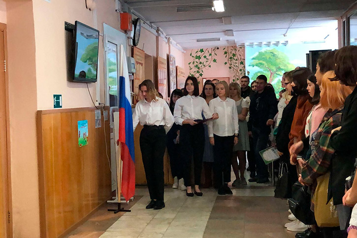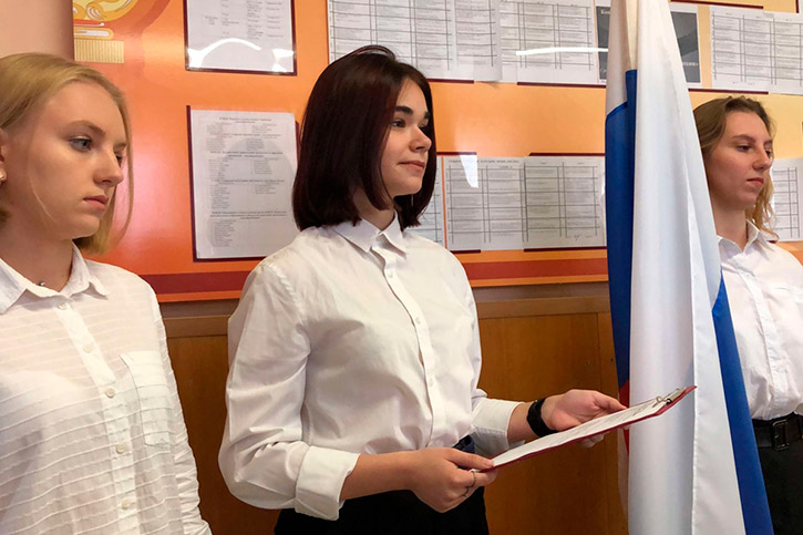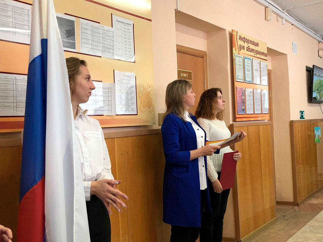 В один из понедельников октября право поднять флаг было предоставлено представителям студенческого самоуправления колледжа: председателю СтудСовета - Марии Костенко, студ. 3 курса ДПИиНП, заместителю председателя СтудСовета – Пуховой Яне, студ 3 курса СКД и председателю СтудСовета общежития-Лагачевой Юлии, студ. 3 курса СКД. Поднятие флага сопровождалось гимном Российской Федерации, который после оглашения знаменательных событий дружно исполняли студенты всего колледжа. Преподаватель истории и обществознания Берш И.А. поздравила всех с началом новой учебной недели, пожелала студентам и преподавателям успехов и хороших оценок.