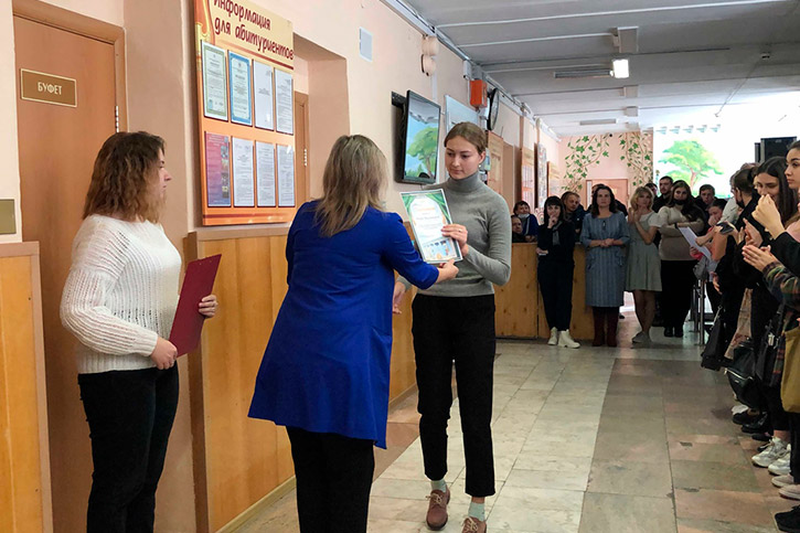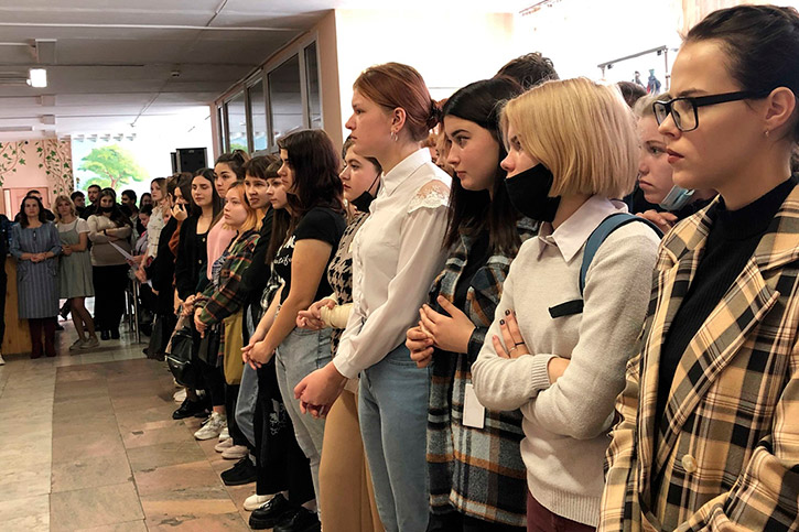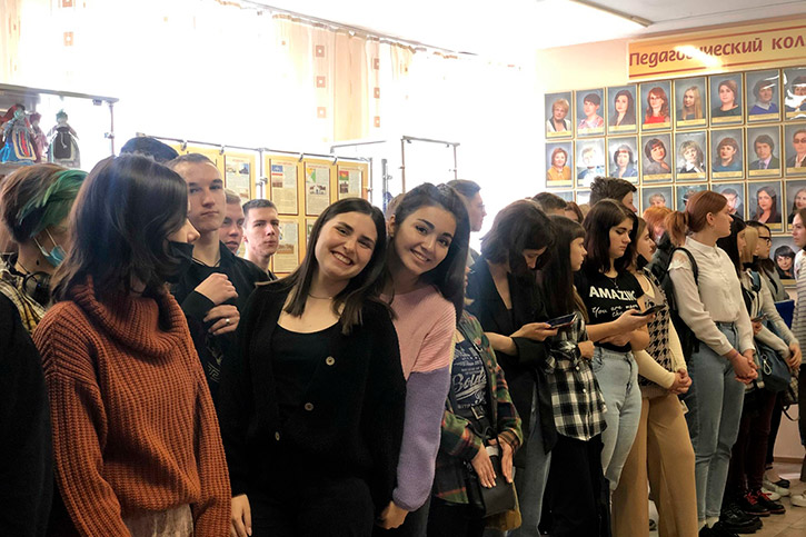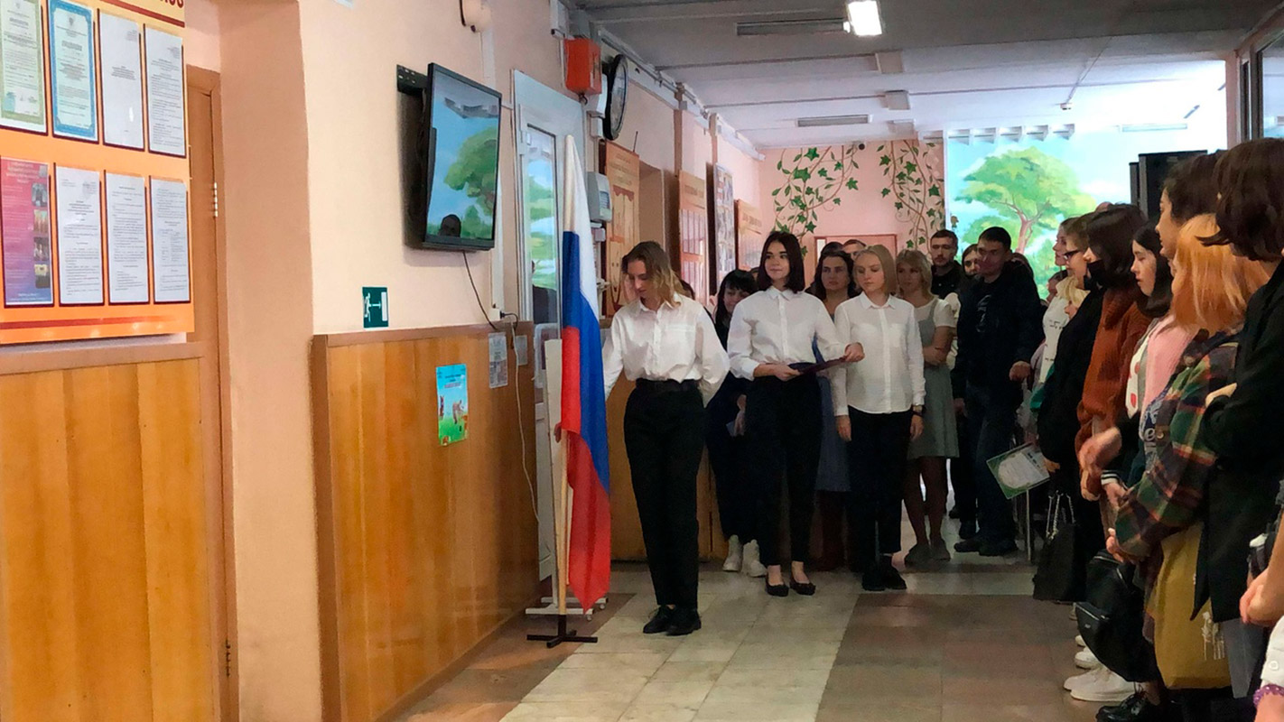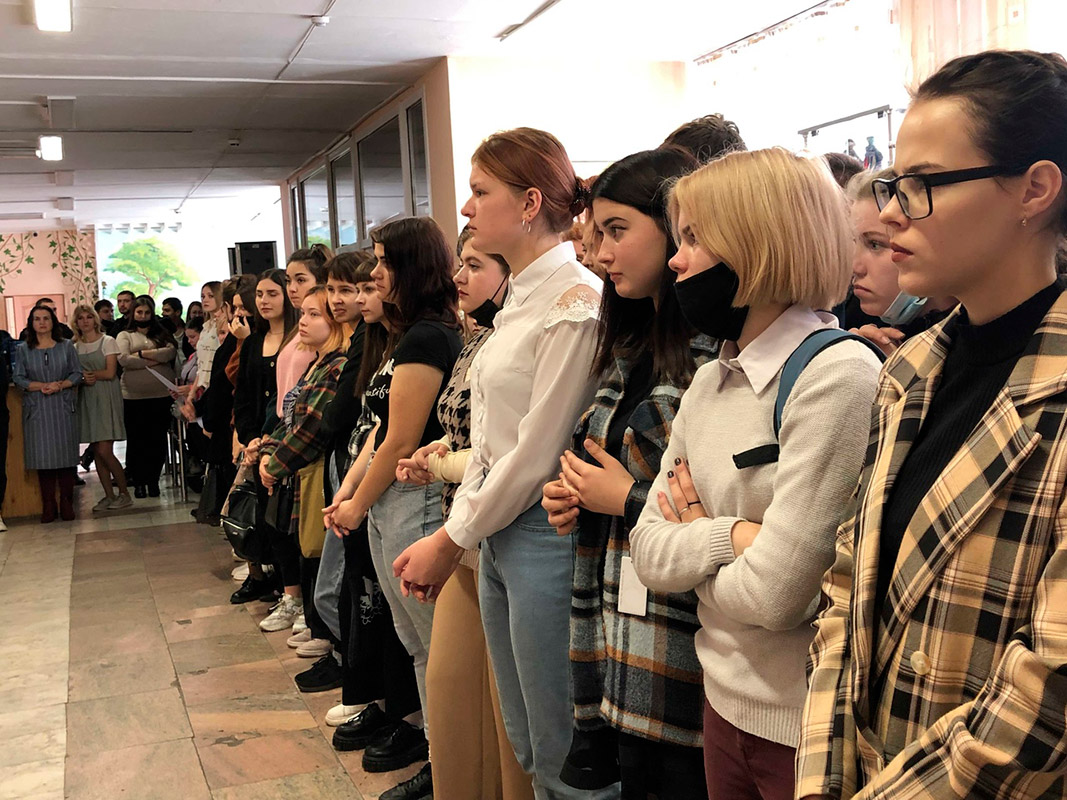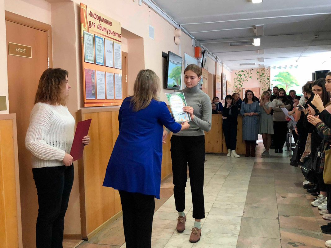 В один из понедельников октября право поднять флаг было предоставлено представителям студенческого самоуправления колледжа: председателю СтудСовета - Марии Костенко, студ. 3 курса ДПИиНП, заместителю председателя СтудСовета – Пуховой Яне, студ 3 курса СКД и председателю СтудСовета общежития-Лагачевой Юлии, студ. 3 курса СКД. Поднятие флага сопровождалось гимном Российской Федерации, который после оглашения знаменательных событий дружно исполняли студенты всего колледжа. Преподаватель истории и обществознания Берш И.А. поздравила всех с началом новой учебной недели, пожелала студентам и преподавателям успехов и хороших оценок.
