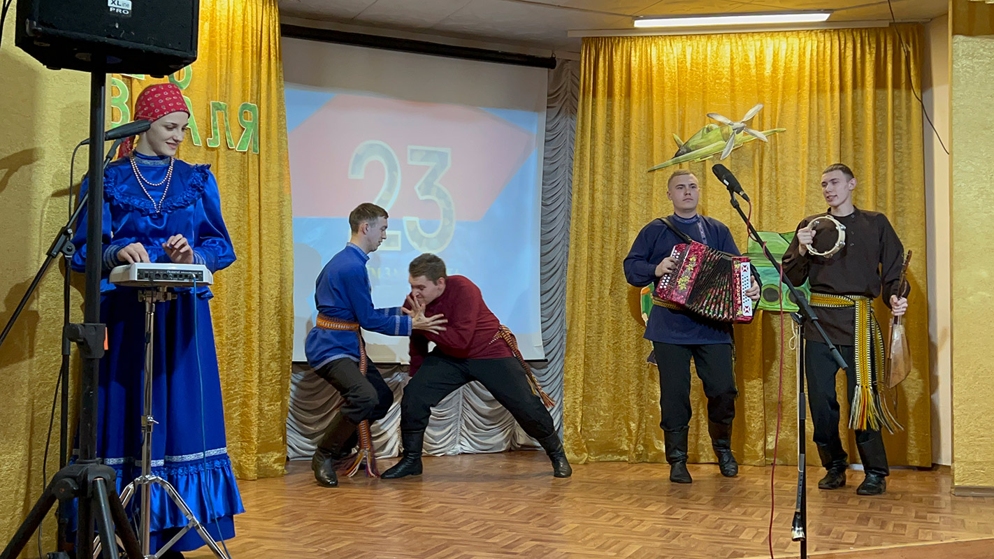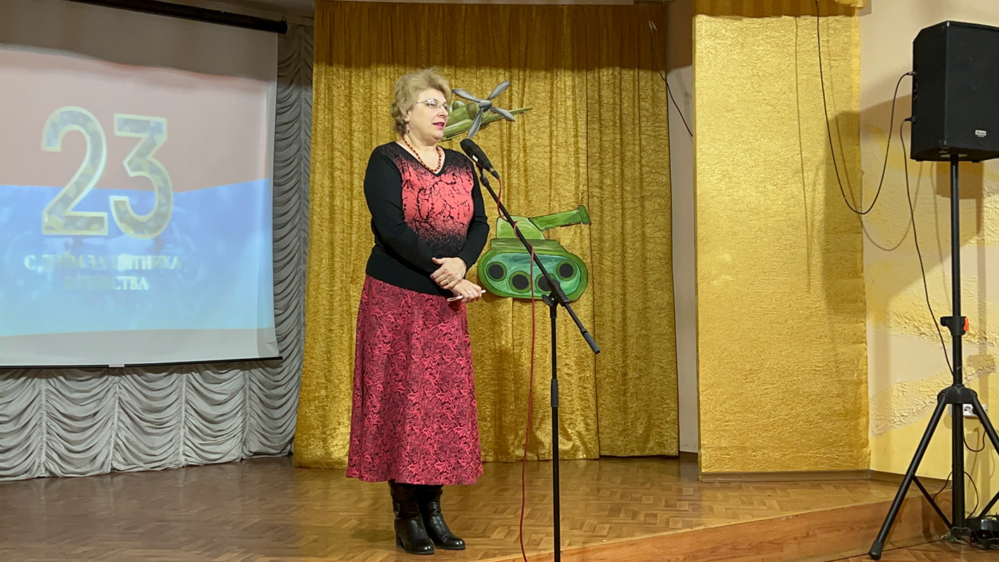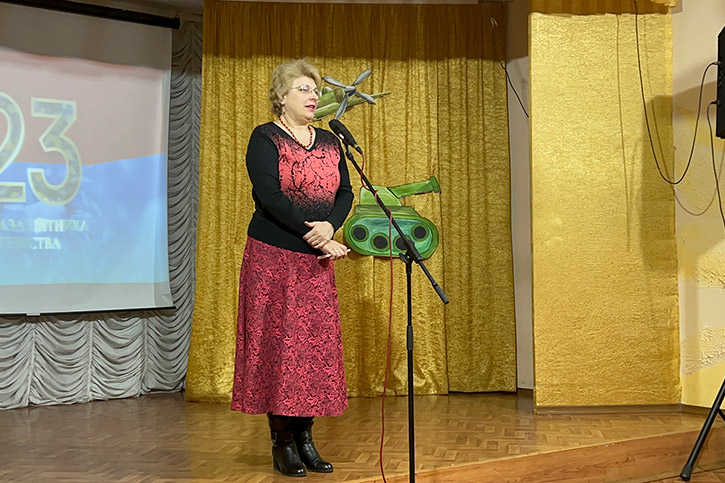 В официальной части концерта с поздравительной речью выступила заведующая филиалом Калабугина М.Г. "Нет на свете выше долга, чем защищать свою родину, свой дом, свою семью, поэтому праздник День защитника Отечества очень любим и почитаем. В этот день мы отдаём дань глубокого уважения и признательности всем поколениям защитников Отечества, чествуем тех, кто защищал нашу родину в годы войны, охранял её в мирное время, и кто сегодня дал присягу и готов в любой момент встать на защиту безопасности нашего государства. Это праздник настоящих мужчин — смелых и отважных, ловких и надёжных, а также праздник мальчиков, которые вырастут и станут защитниками Отечества!".