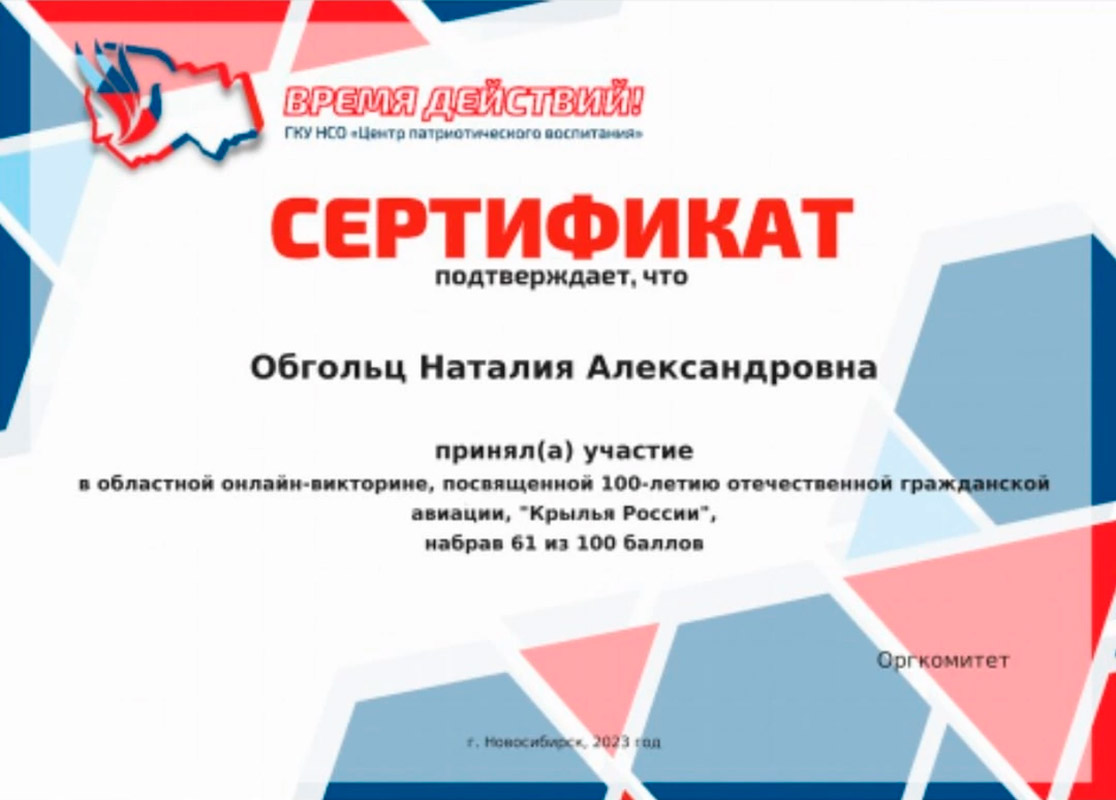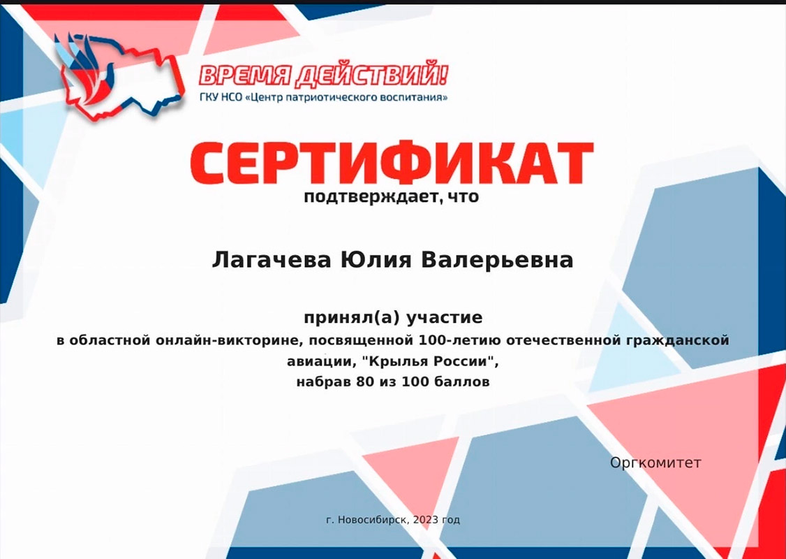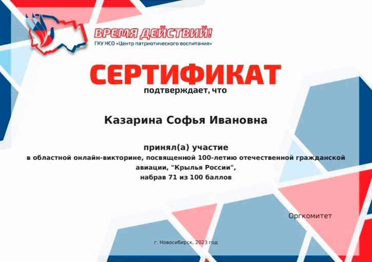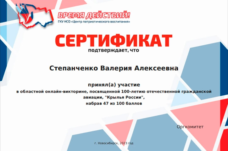 Студенты Барабинского филиала приняли участие в онлайн-викторине "Крылья России" с 10 по 25 марта 2023 года в Новосибирской области на платформе "Знаю Россию"
