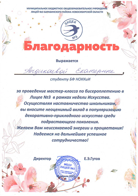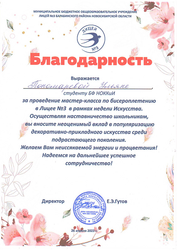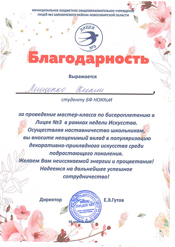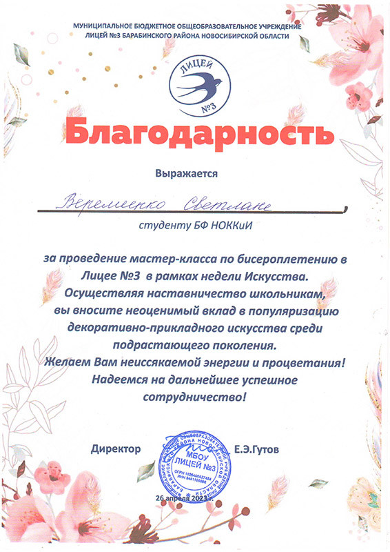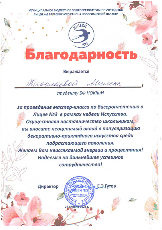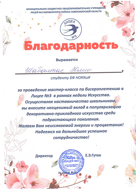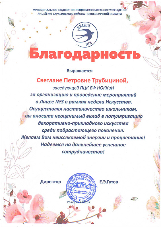 Лицей №3 города Барабинска выражает слова благодарности Марине Геннадьевне Калабугиной, заведующей Барабинским филиалом НОККиИ и Светлане Петровне Трубициной, заведующей ПЦК специальности "Декоративно-прикладное искусство и народные промыслы" за плодотворное сотрудничество в проведении мероприятий в рамках "Недели искусства" и реализации модели наставничества.