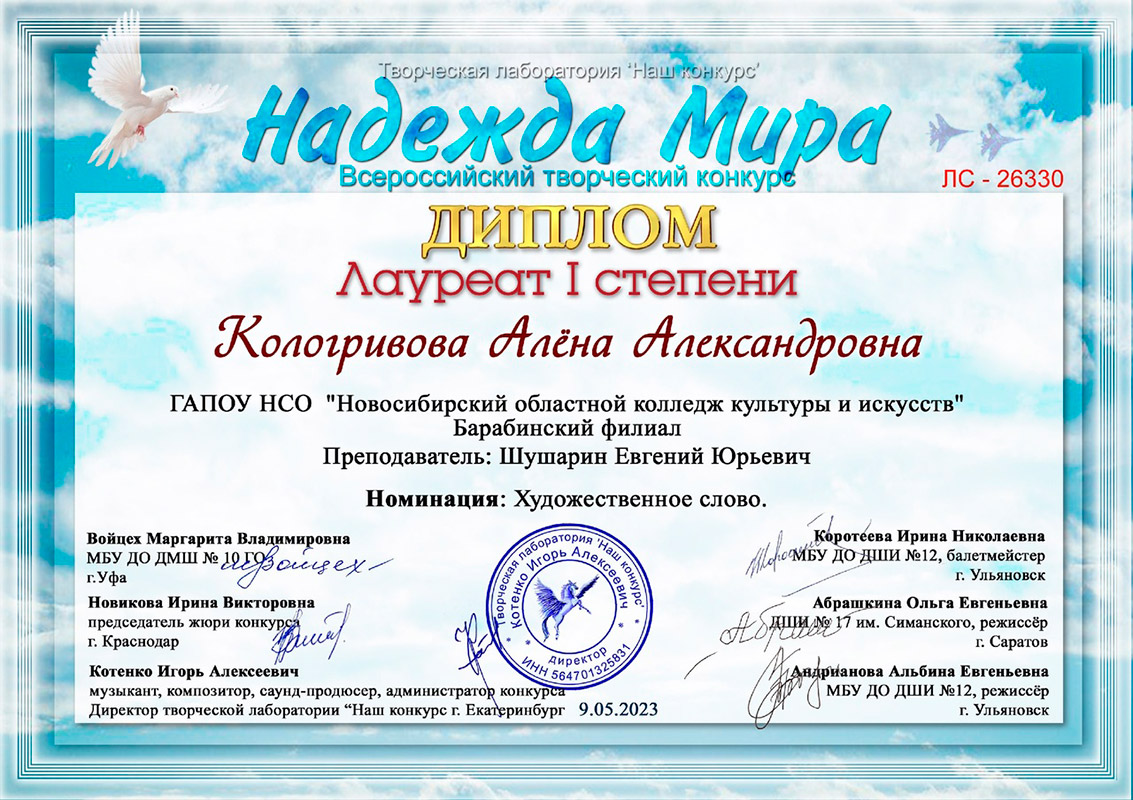 Кологривова Алёна студентка специальности "Социально-культурная деятельность" приняла участие во Всероссийском творческом конкурсе "Надежда Мира" направленного на развитие творческого потенциала участников творческих объединений, клубных формирований, образовательных учреждений.