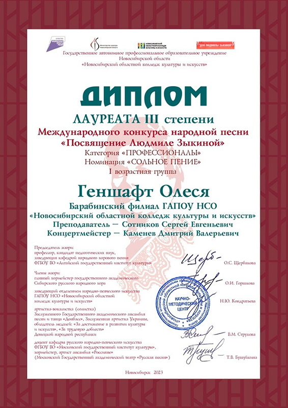 Творческие коллективы и солисты специальности "Сольное и хоровое народное пение" Барабинского филиала приняли участие в Международном конкурсе народной песни "Посвящение Людмиле Зыкиной".