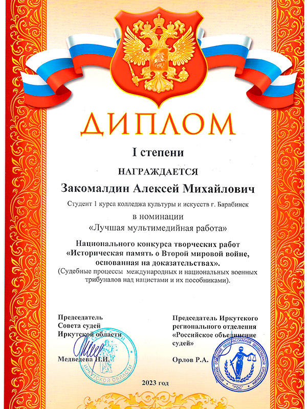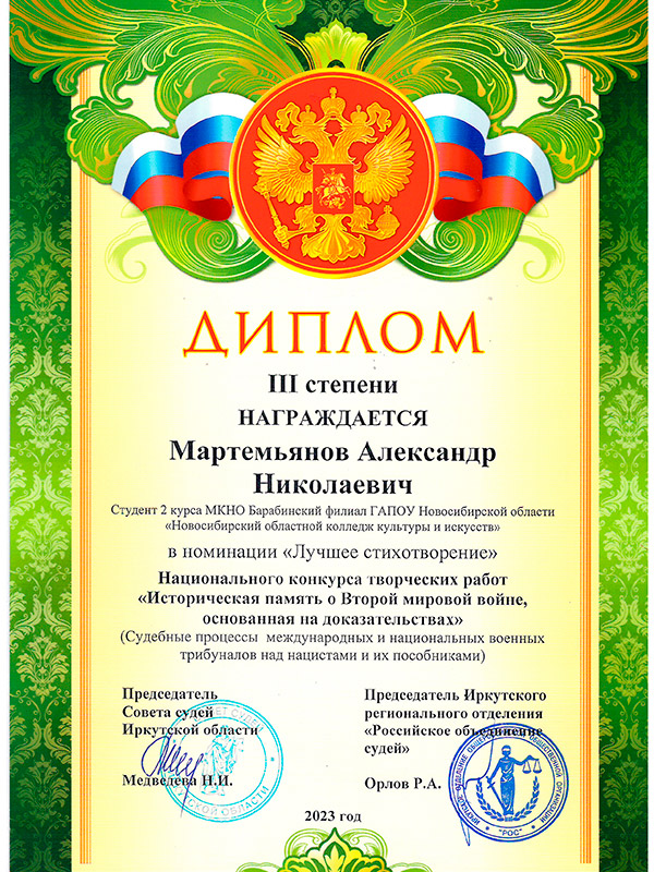 Студенты колледжа приняли участие в национальном творческом конкурсе Российского объединения судей "Историческая память о Второй мировой войне", основанная на доказательствах", под руководством преподавателя истории и обществознания Барабинского филиала ГАПОУ НСО Берш И.А.