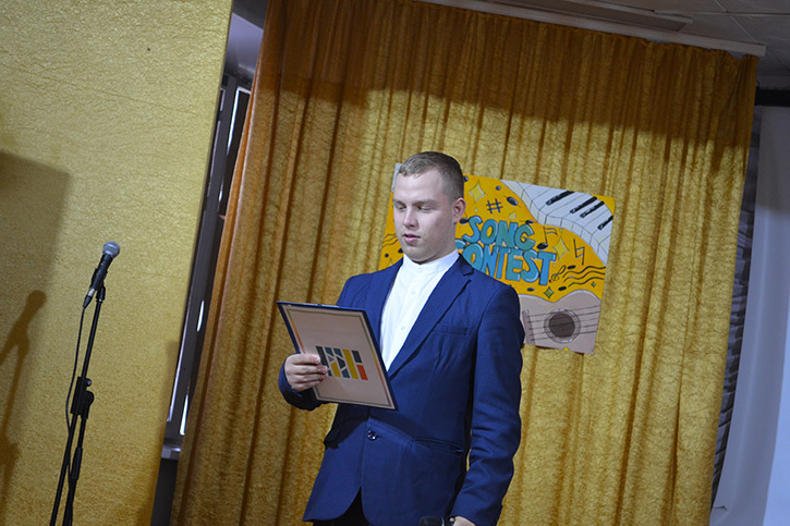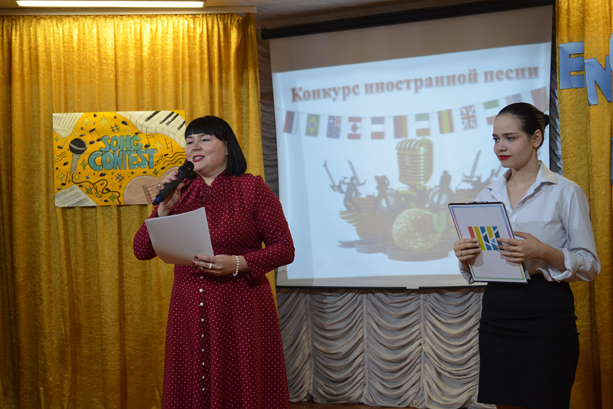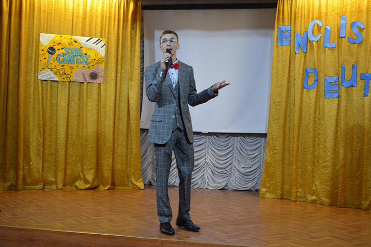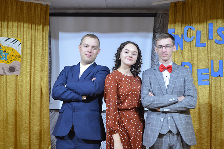 Ведущими конкурса были студенты 2 курса специальности СКД Николаев Артем и Полина Орёл. Они приветствовали конкурсантов на английском и русском языках, провели шуточные игры со зрителями "Instruments in English", "Guess the song!"