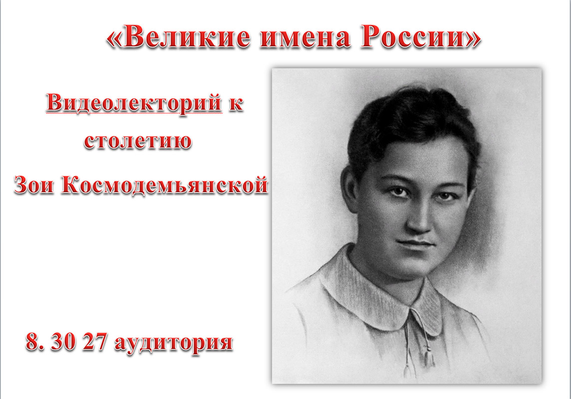 В 2023 году исполняется 100 лет со дня рождения Зои Космодемьянской. История первой женщины-героя Советского Союза в годы Великой Отечественной войны облетела весь мир. Во вторник преподаватель истории Берш И.А. провела со студентами видеолекторий о подвиге Зои Космодемьянской, так как в год 100-летия со дня её рождения, важно вспомнить о человеке, ставшем символом антифашистской борьбы, несгибаемости советских людей, показавшем небывалую волю к победе, нежелание сдаваться и подчиняться врагу.