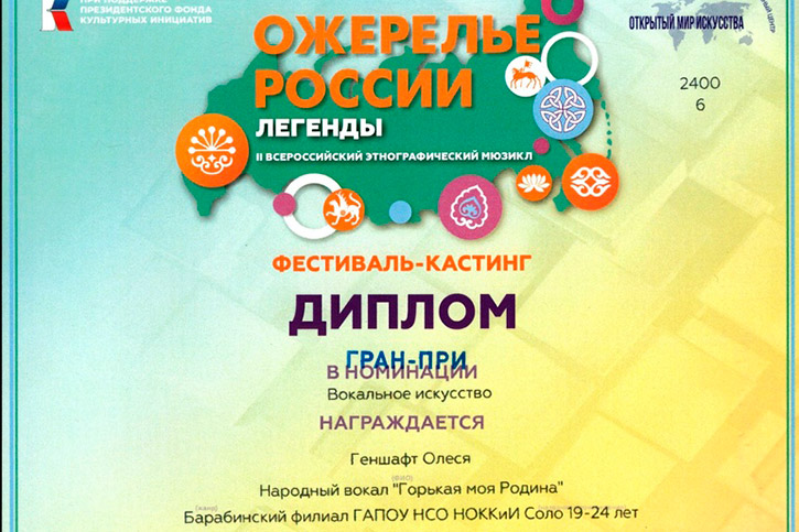 В г.Новосибирске 27-28 января 2024 года состоялись прослушивания в рамках фестиваля-кастинга "Ожерелье России" при поддержке Президентского фонда культурных инициатив. Геншафт Олеся, студентка БФ ГАПОУ НСО "НОККиИ", стала обладателем ГРАН-ПРИ в номинации вокальное искусство (народный вокал).