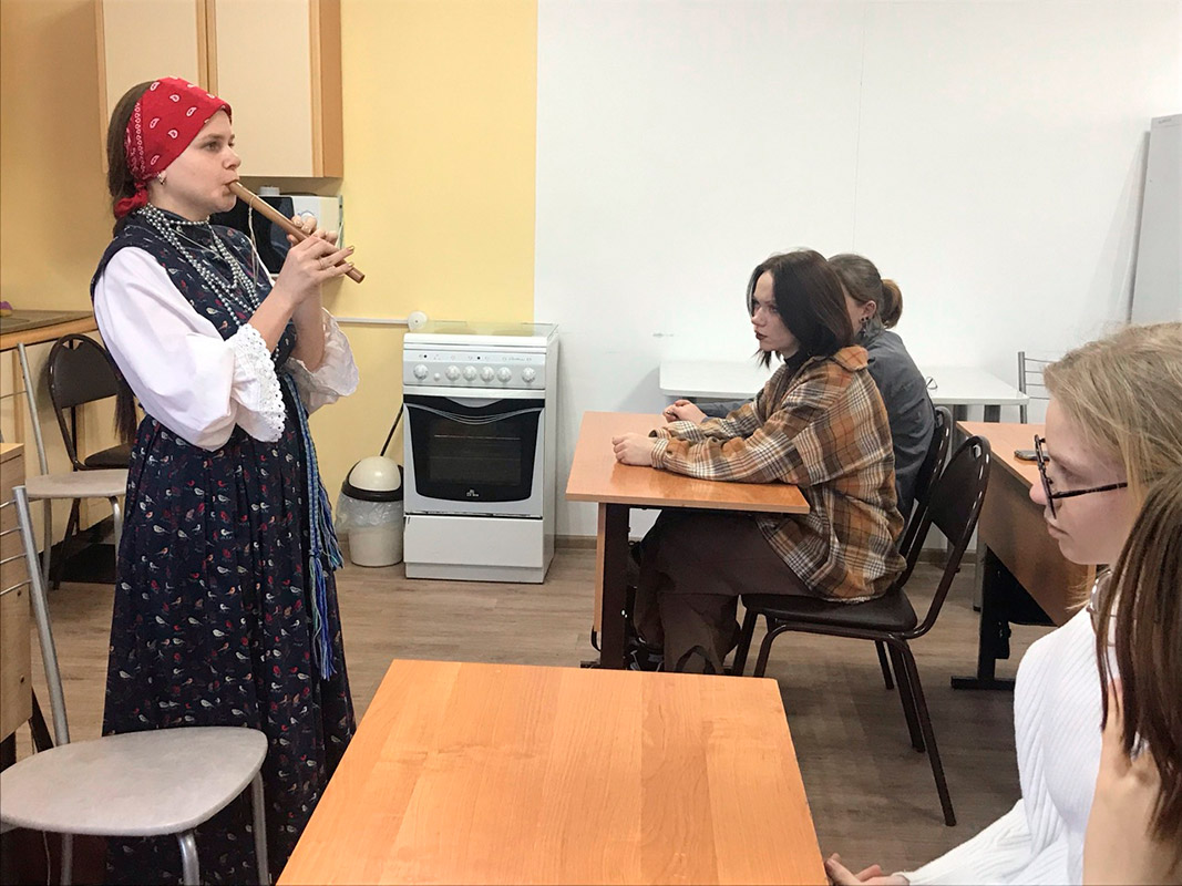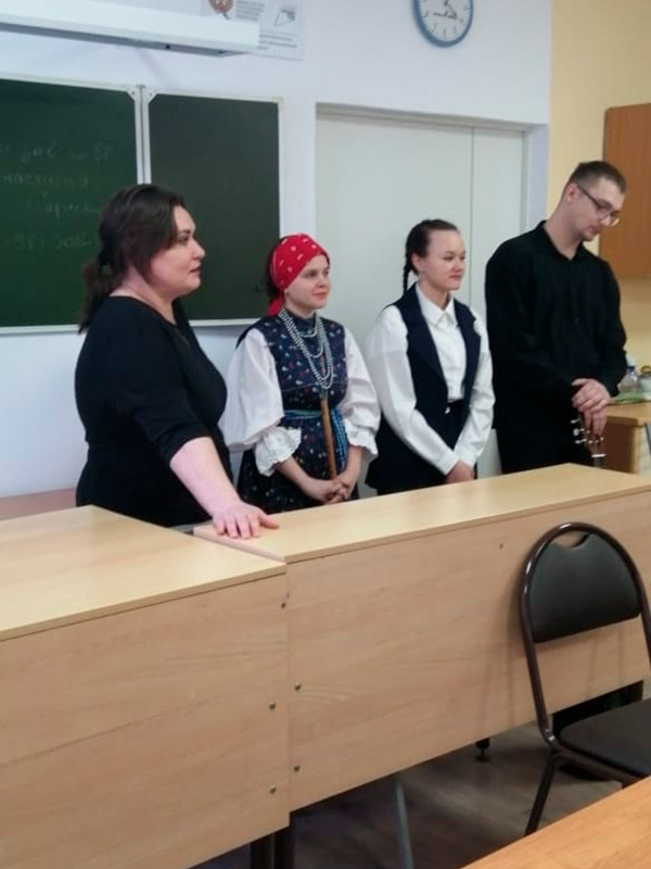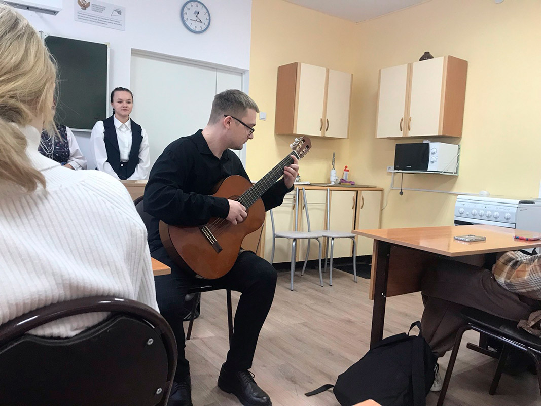 Молодые таланты подарили возможность школьникам - и учителям насладиться музыкой. Галушкина А. НХТ-49, руководитель Синчуков С.В. и Тормоза Н.С., Шикеря К., ПДО-34, руководитель Гончаров А.В., Петрищева К. СиХНП-21, Борушевская С.А. подготовили концертные номера и продемонстрировали свое владение искусством игры на гитаре, гуслях и свирели. Гармоничный голос и мастерство игры на инструментах показала Галушкина А., великолепное исполнение солистки колледжа Петрищевой К.