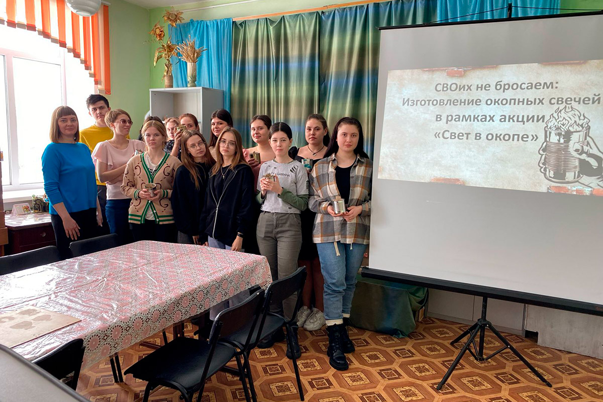 Сначала студентам была представлена презентация по технологии изготовления окопных свечей, а затем они с воодушевлением приступили к работе. Окопные свечи- очень полезная в солдатском быту вещь, как показал видеоролик, присланный от ребят с СВО.
