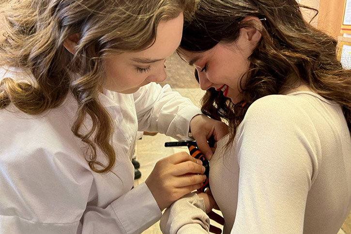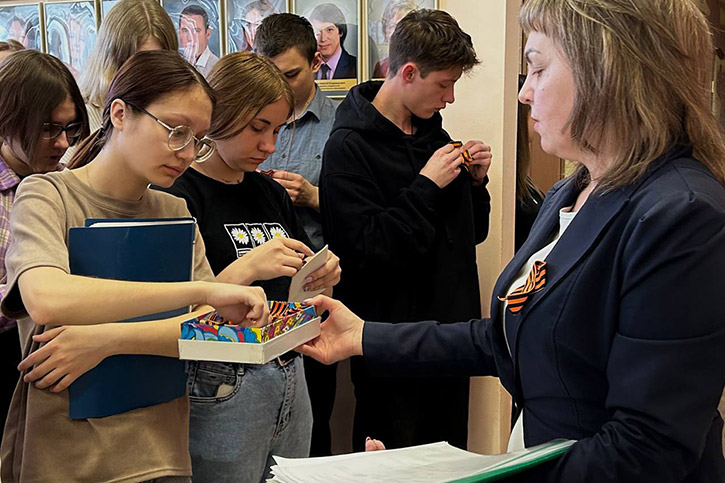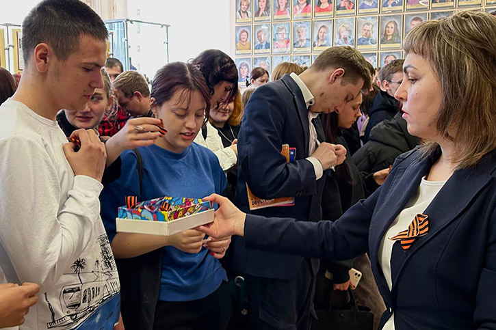 Во время торжественной линейки преподаватель истории И.А.Берш раздала студентам и преподавателям ленты, объяснив значение и правила закрепления символа на одежде - с левой стороны, ближе к сердцу.