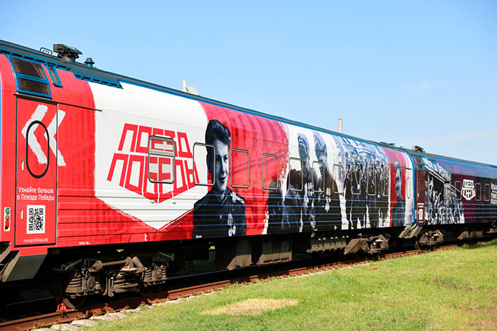 "Поезд Победы" - это первая в мире иммерсивная инсталляция, размещенная в движущемся поезде. В основе - история о Великой Отечественной войне, рассказанная от лица ветерана-железнодорожника. Экспозиция была создана в 2020 году в рамках Года Памяти и Славы, она включает уникальные скульптуры и мультимедийное сопровождение: 50 видеопроекторов, 18 видеостен, 12 тач-столов, которые благодаря световым и звуковым эффектам воссоздают эпизоды воздушных боев и танковых сражений, походной жизни солдат и мирных воспоминаний довоенного времени. Впервые в Новосибирскую область "Поезд Победы" приезжал в 2021 году.