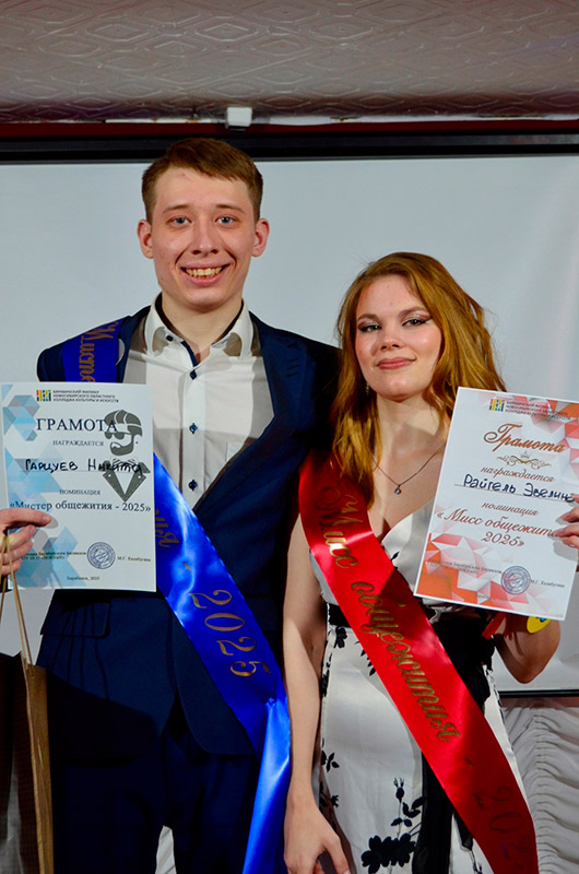 По итогам всех конкурсных испытаний титул "Мисс общежития-2025" завоевала Эвелина Райгель, студентка 3-го курса специальности "Народное художественное творчество", а "Мистером общежития-2025" стал Никита Гарцуев, студент 2-го курса специальности "Социально-культурная деятельность".