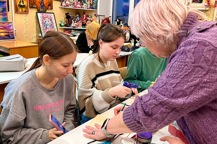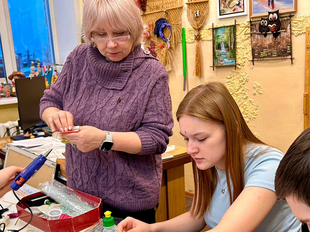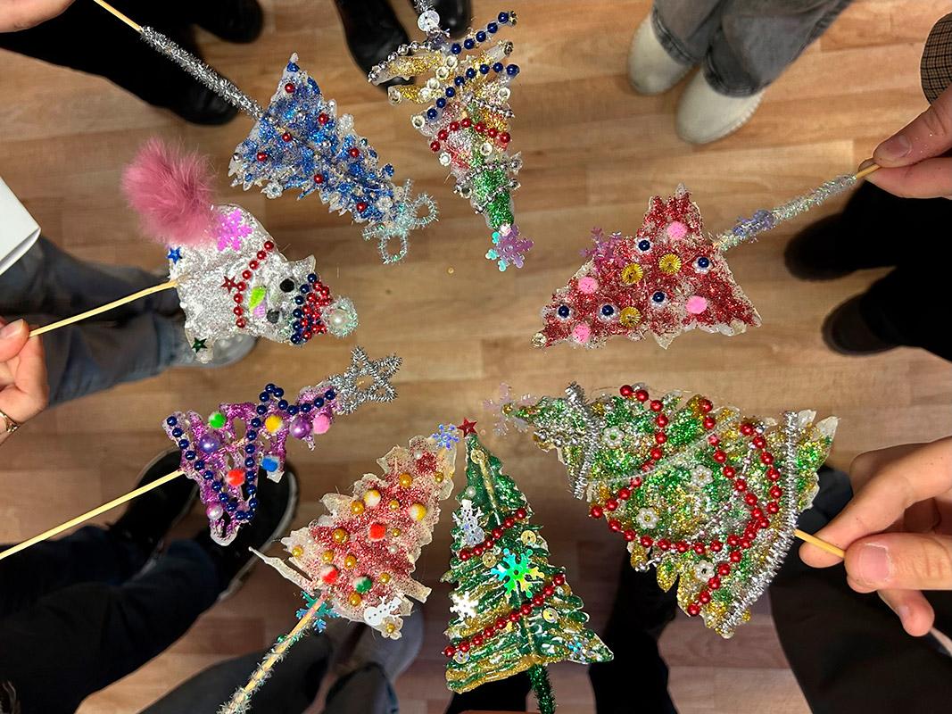 А самым увлекательным этапом стало декорирование получившихся силуэтов. Студенты активно использовали разнообразные блестящие материалы: мелкие бусины и яркие блестки, превращая свои работы в настоящие мерцающие символы праздника.